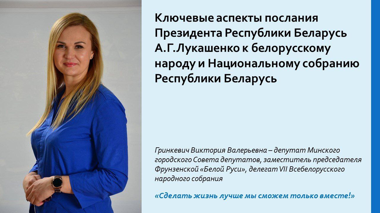 Виктория Гринкевич, депутат Минского городского Совета депутатов, заместитель председателя Фрунзенской «Белой Руси», делегат VII Всебелорусского народного собрания.