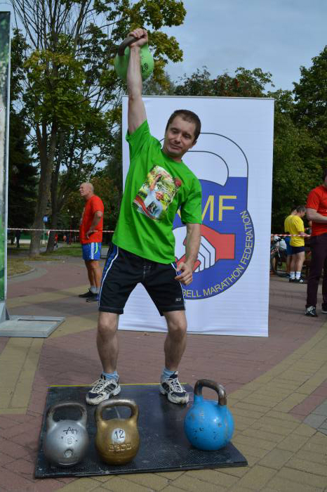 Лучшим в упражнении толчок гири (полумарафон) стал Виталий Павлюков, за 30 минут зафиксировавший над головой гирю 20 кг 621 раз. Алексей Смыкало уступил сопернику 27 повторений, и подняв в общей сложности 11 тонн 880 кг.