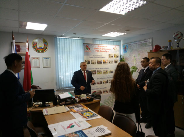 Одним из объектов посещения китайской делегации была штаб-квартира Фрунзенской районной организации г.Минска РОО «Белая Русь». Китайскую делегацию приветствовал депутат Парламента, председатель районной организации Виталий Мисевец. В ходе встречи делегация ознакомилась с работой Фрунзенской районной организации г.Минска РОО «Белая Русь», а также посетила районный Центр общественных объединений и политических партий.