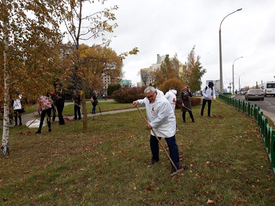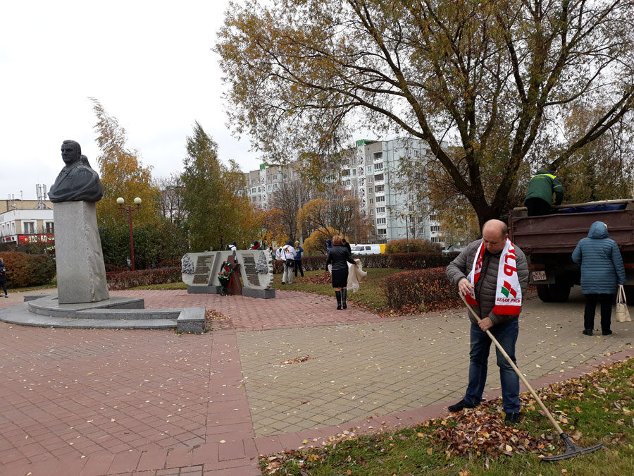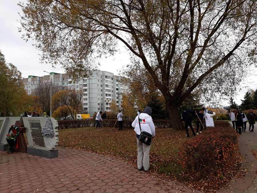 Делом долга и чести считают члены Фрунзенской организации г.Минска РОО «Белая Русь» содержать в достойном состоянии территорию вокруг памятника. А 23 октября ко взрослым присоединилась и молодежь - учащиеся УО «Государственный профессионально-технический колледж хлебопечения».