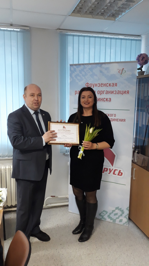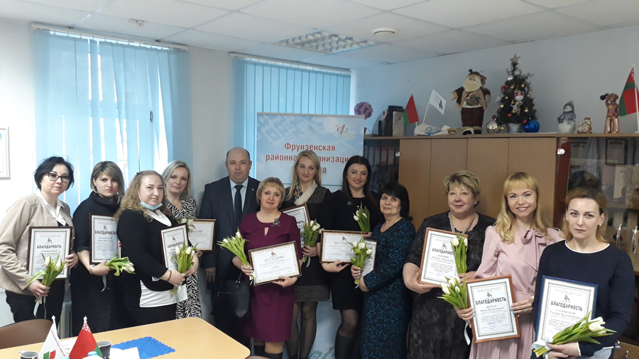 Решением Совета Фрунзенской районной организации г.Минска РОО «Белая Русь» в канун Международного Женского дня 15 председателей первичных организаций награждены Почетными грамотами и благодарностями.