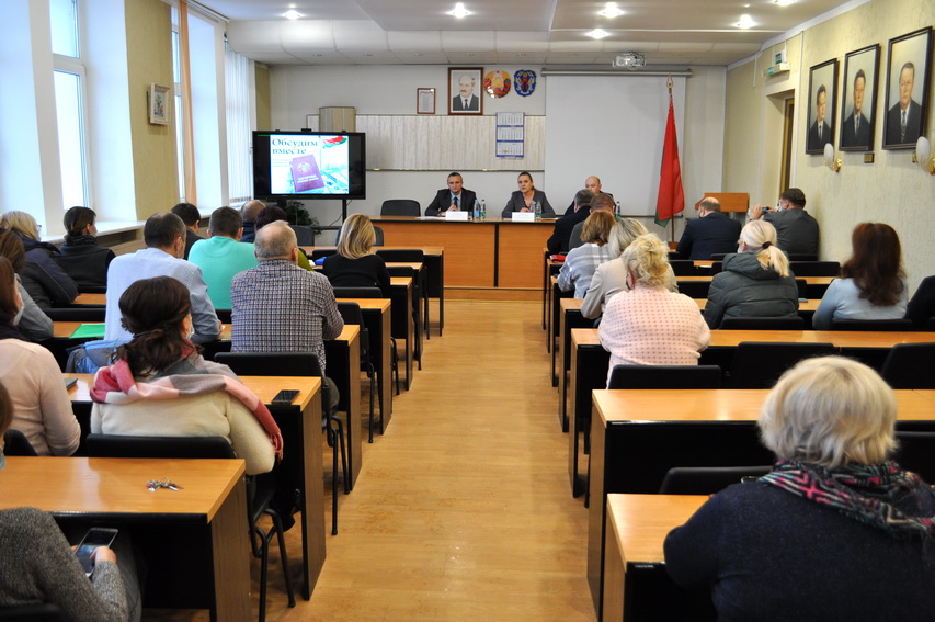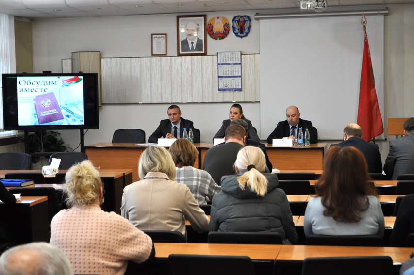 Работники ОАО «МАПИД» собрались на диалоговую площадку по обсуждению проекта изменений и дополнений Конституции Республики Беларусь. Спикерами выступили депутат Палаты представителей Национального собрания Республики Беларусь VII созыва Марина Ленчевская, председатель Фрунзенской районной организации РОО «Белая Русь» Игорь Тимашишин, заместитель генерального директора по кадрам, быту и идеологической работе ОАО «МАПИД» Сергей Малашук. С.В. В диалоге приняли участие представители отделов аппарата генеральной дирекции.
