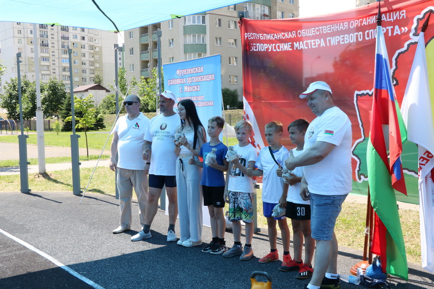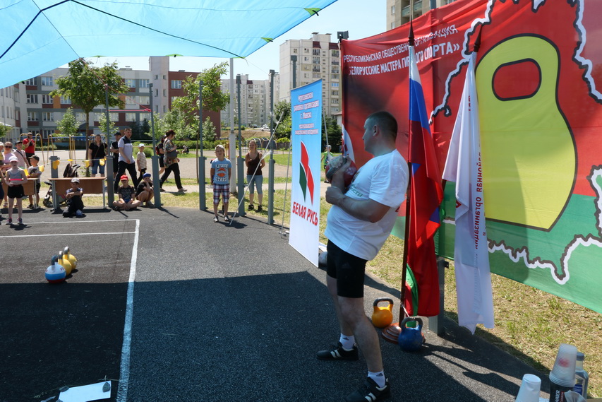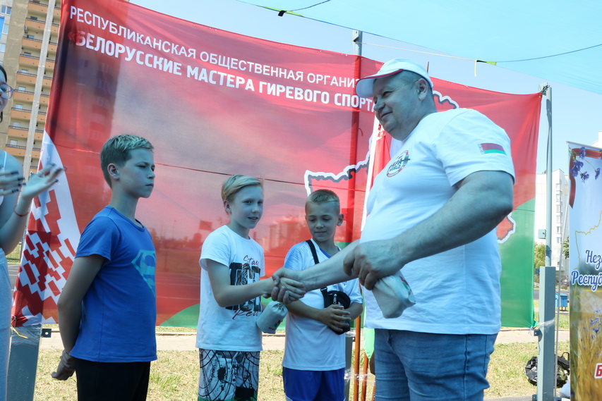 Кстати, дети прямо там, на месте, смогли сами попробовать поднять гирю. Условия просты: кто сколько раз сможет за минуту поднять. Вес гири — 8 кг. Участвовала даже девочка. Но первое место досталось мальчишке — 58 раз он успел поднять гирю. Все по правилам — дотягивая вверх. Юный спортсмены получили презенты от «Белой Руси».