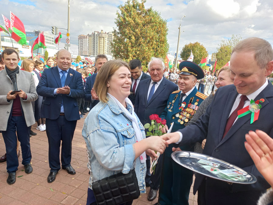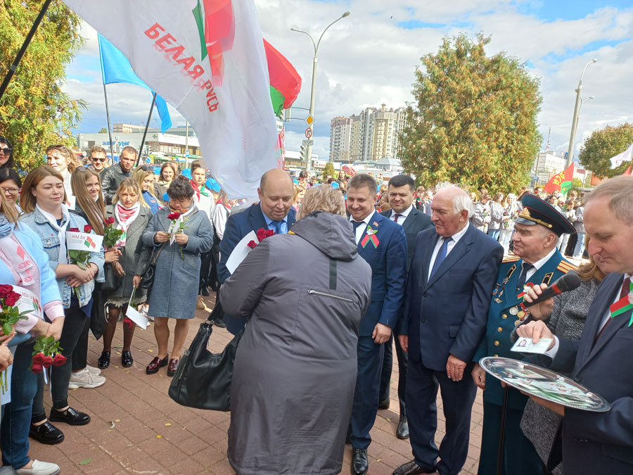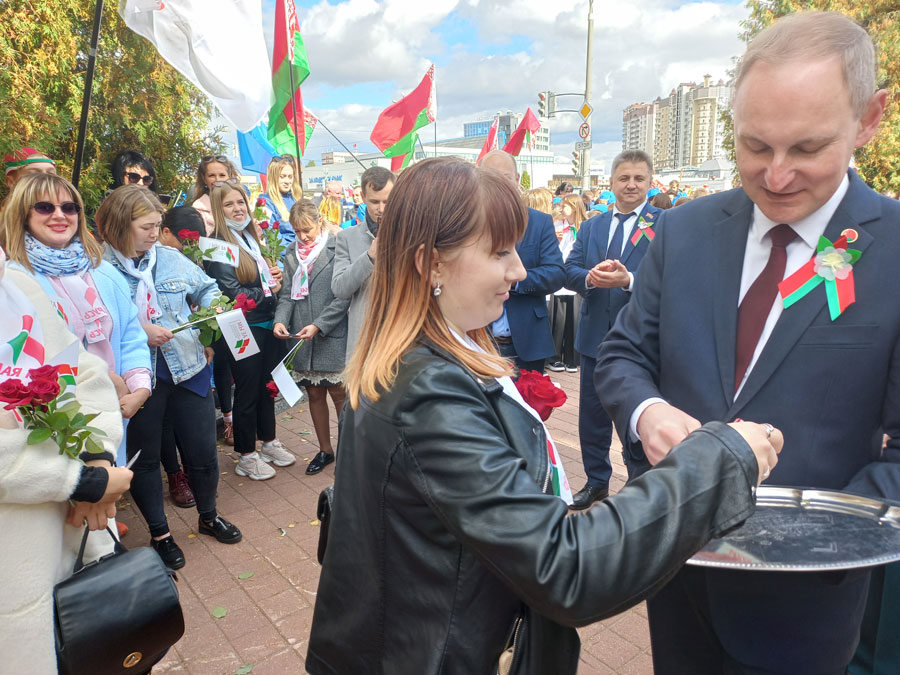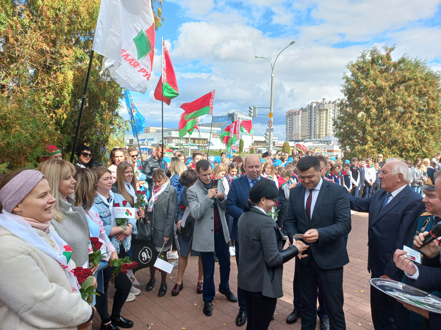 У памятника герою - земляку юным фрунзенцам почетные гости церемонии повязали пионерские галстуки, молодым людям вручили билеты члена БРСМ. Новыми членами пополнились в этот день ряды районных организаций «Белорусский союз женщин» и Республиканского общественного объединения «Белая Русь».